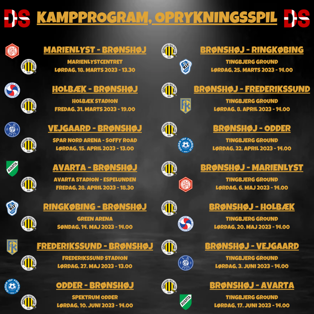 Kampprogrammet for forårets oprykningsspil er på plads. Der venter kampe i Jylland, på Fyn og på Sjælland.